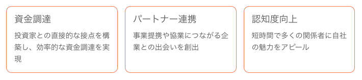 投資家との接点を構築し、資金調達の機会を拡大する絶好の場となります。短期間で複数の投資家に対して自社の魅力をアピールでき、効率的な資金調達が可能です。
