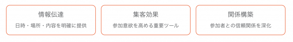 イベントの日時、場所、内容、参加方法を明確に伝え、参加者がスムーズに参加できるよう促します。情報が不足していると参加意欲が低下するため、正確で分かりやすい情報提供が不可欠です。