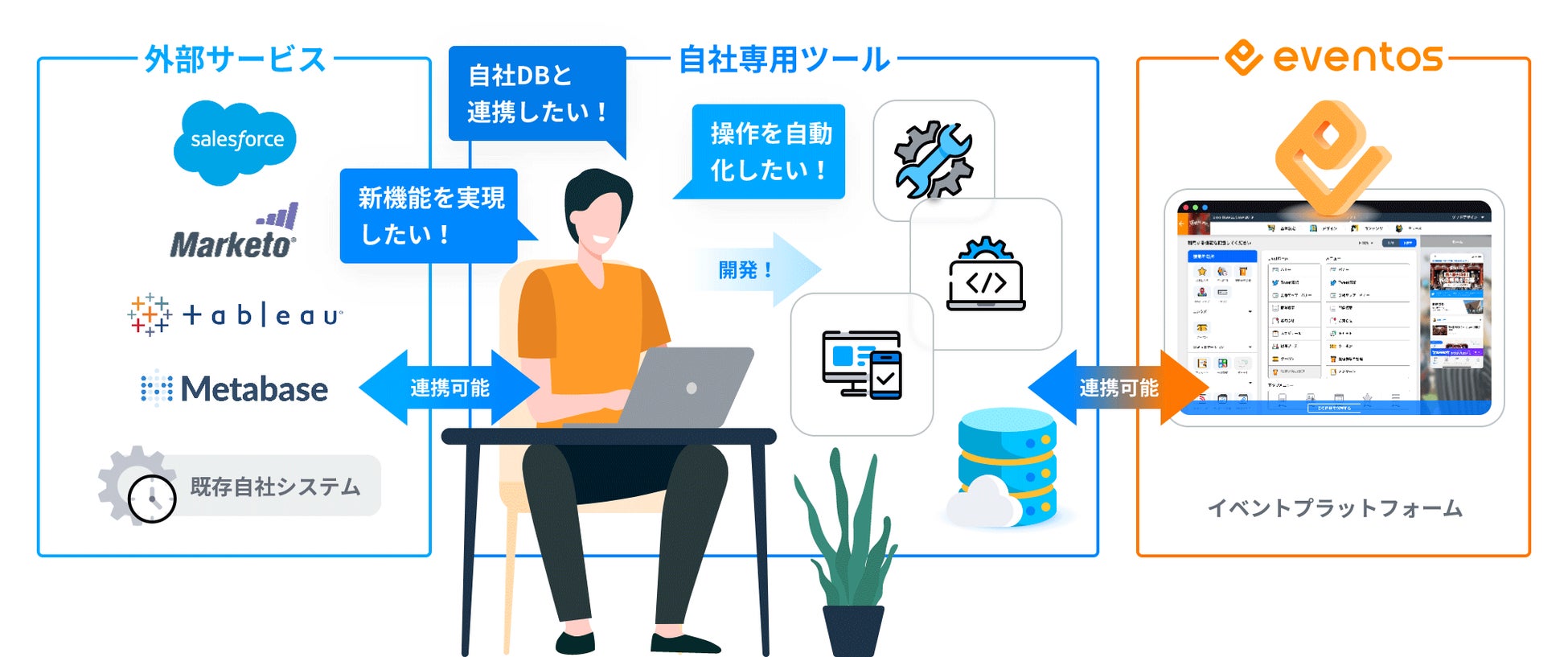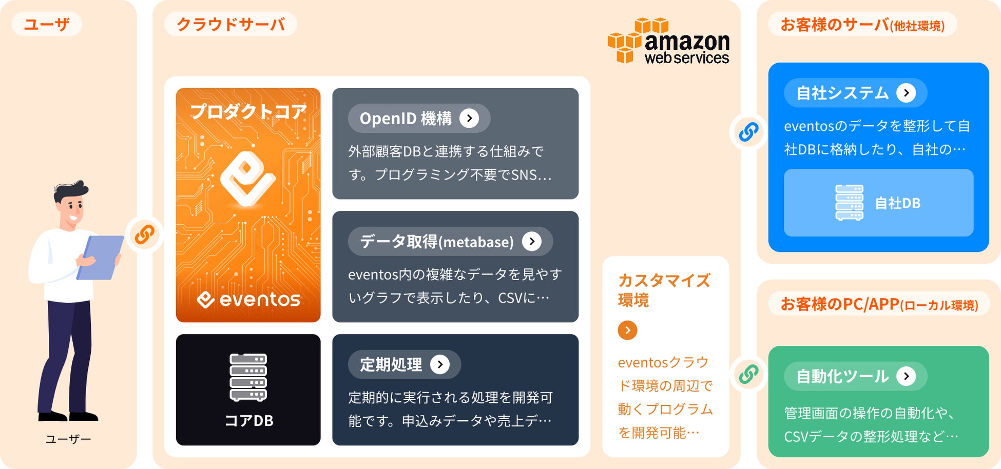 eventosのデータを整形して自社DBに格納したり、自社の顧客DBを使用してeventosにログインできるようにすることもできます。 またイベントで使う独自の新機能の開発も可能です。