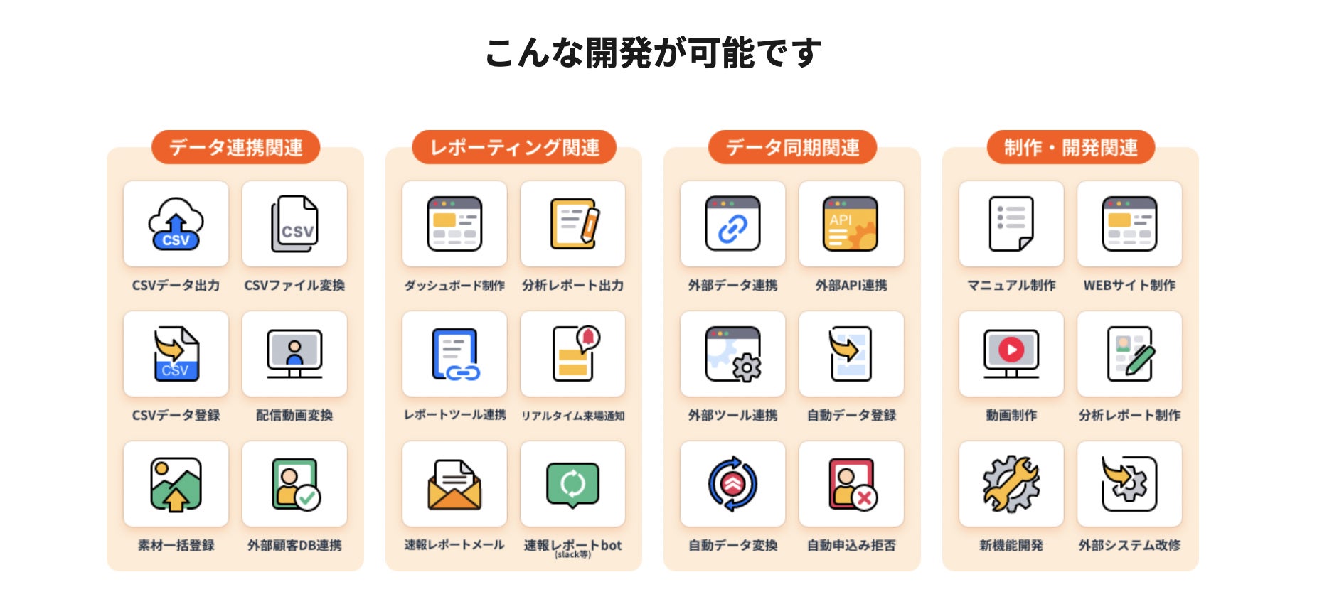これまで紹介した通り、eventosではプラットフォームとして多岐にわたるカスタマイズを実現させることが可能となり、上記にて紹介のように顧客DBのダウンロード、アップロードを行う「データ連携処理」、数値分析などを実現する「レポーティング」、外部データとの連携を行う「データ同期」、更にはWEB・動画などを制作する「制作・開発関連」の実現が可能となっております。