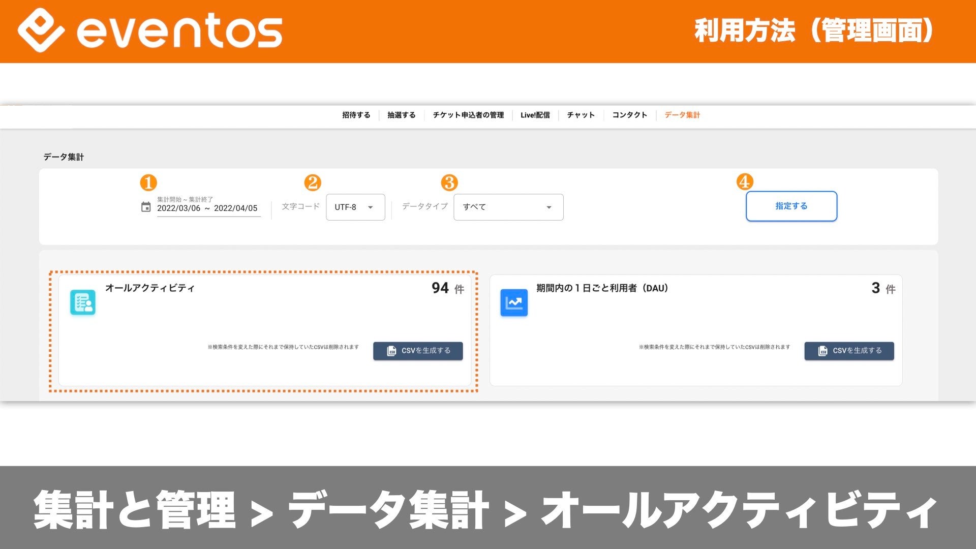 eventosの管理画面における「集計と管理」>「データ集計」>「オールアクティビティ」よりCSV形式でログの取得が可能となります。