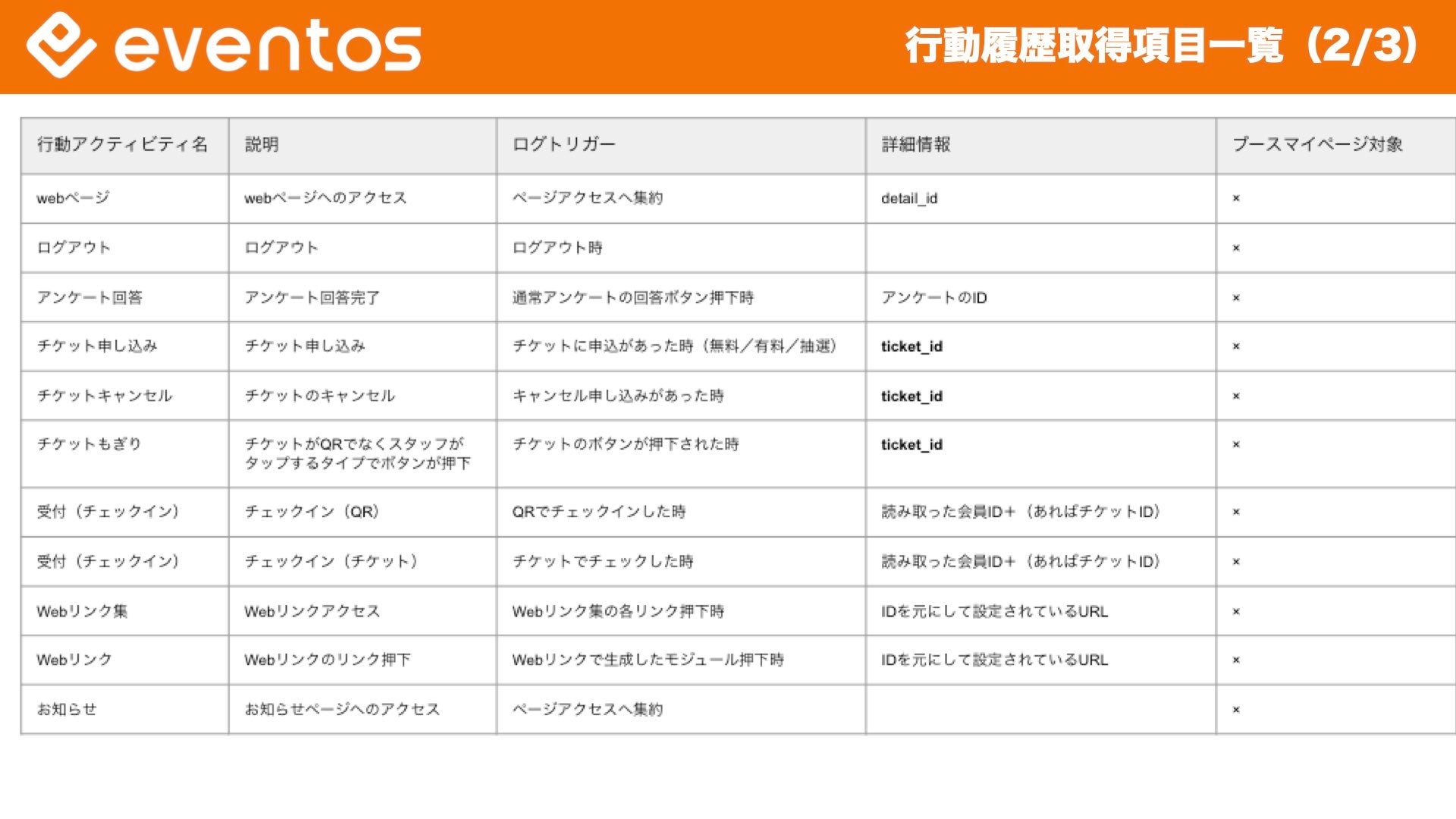 イベントやブース単位でソートした際は、イベントやブースにおける行動履歴の取得が可能となります。