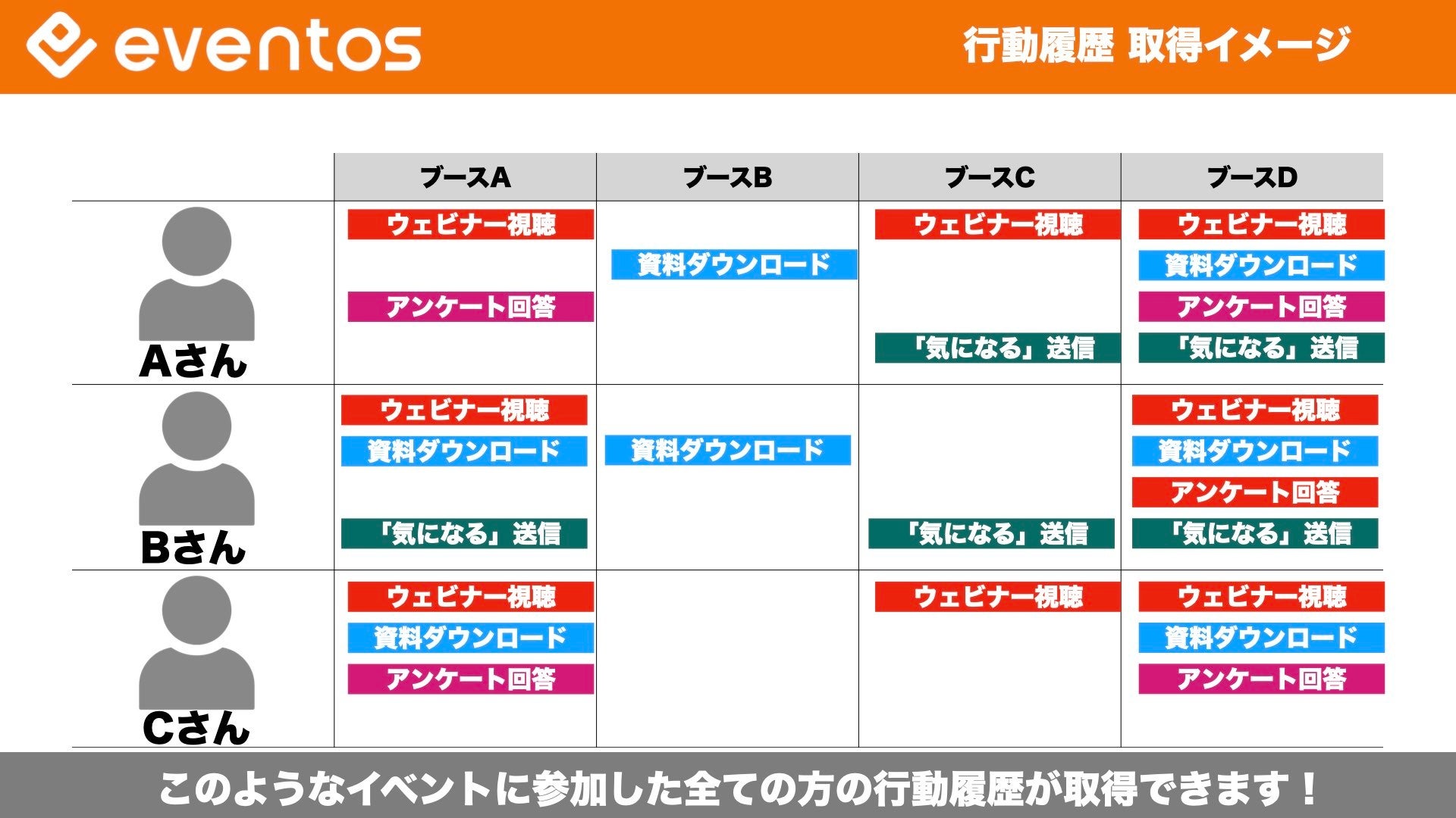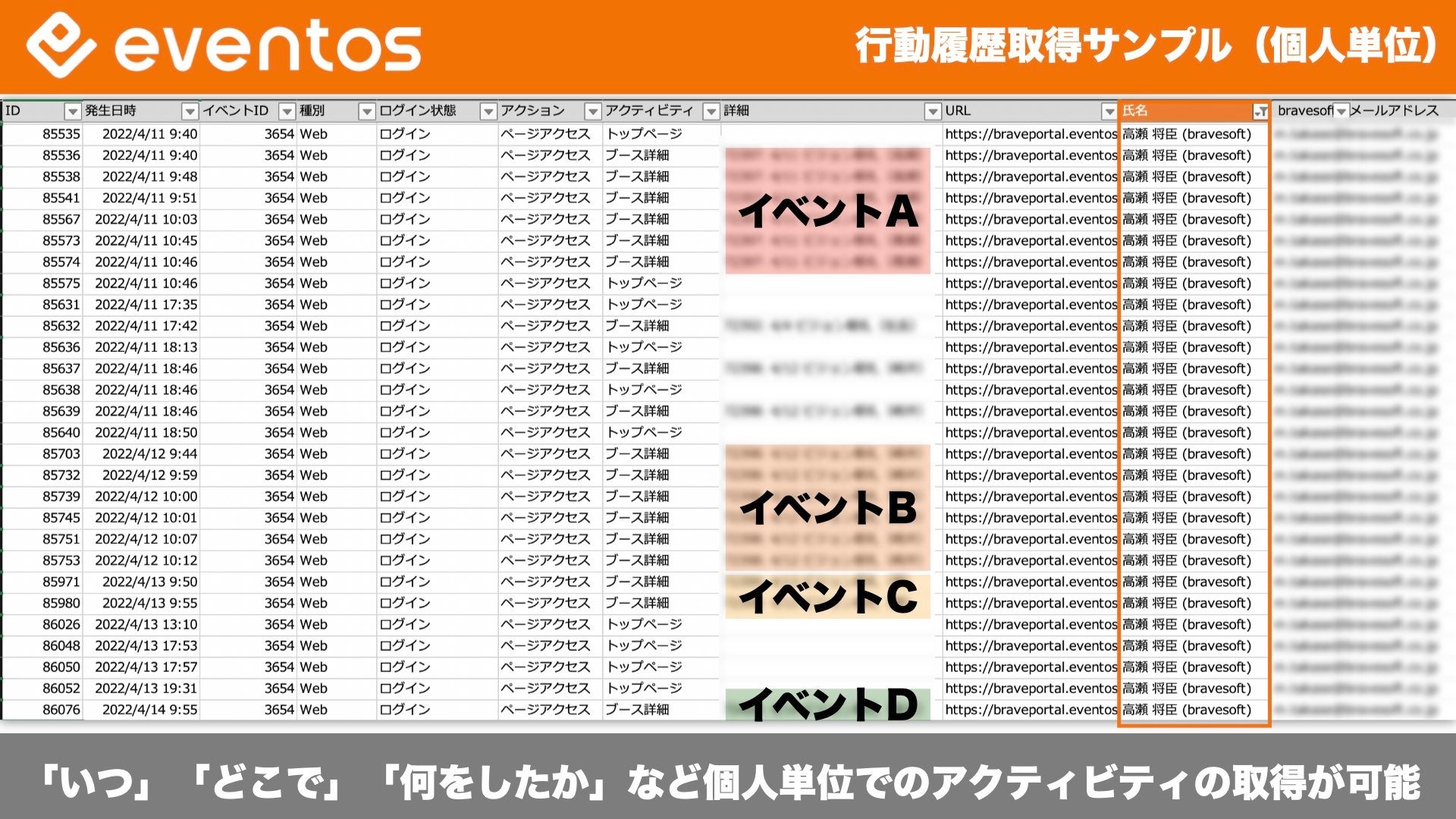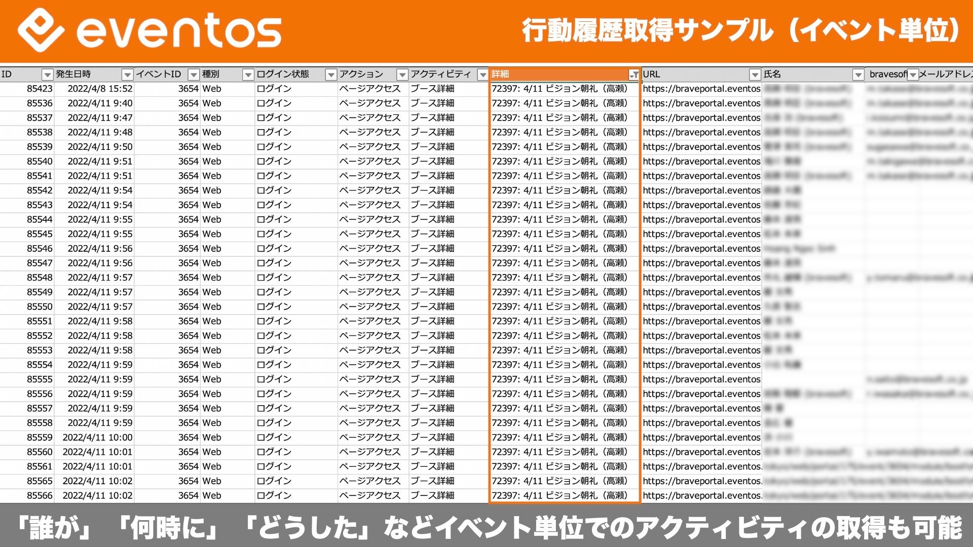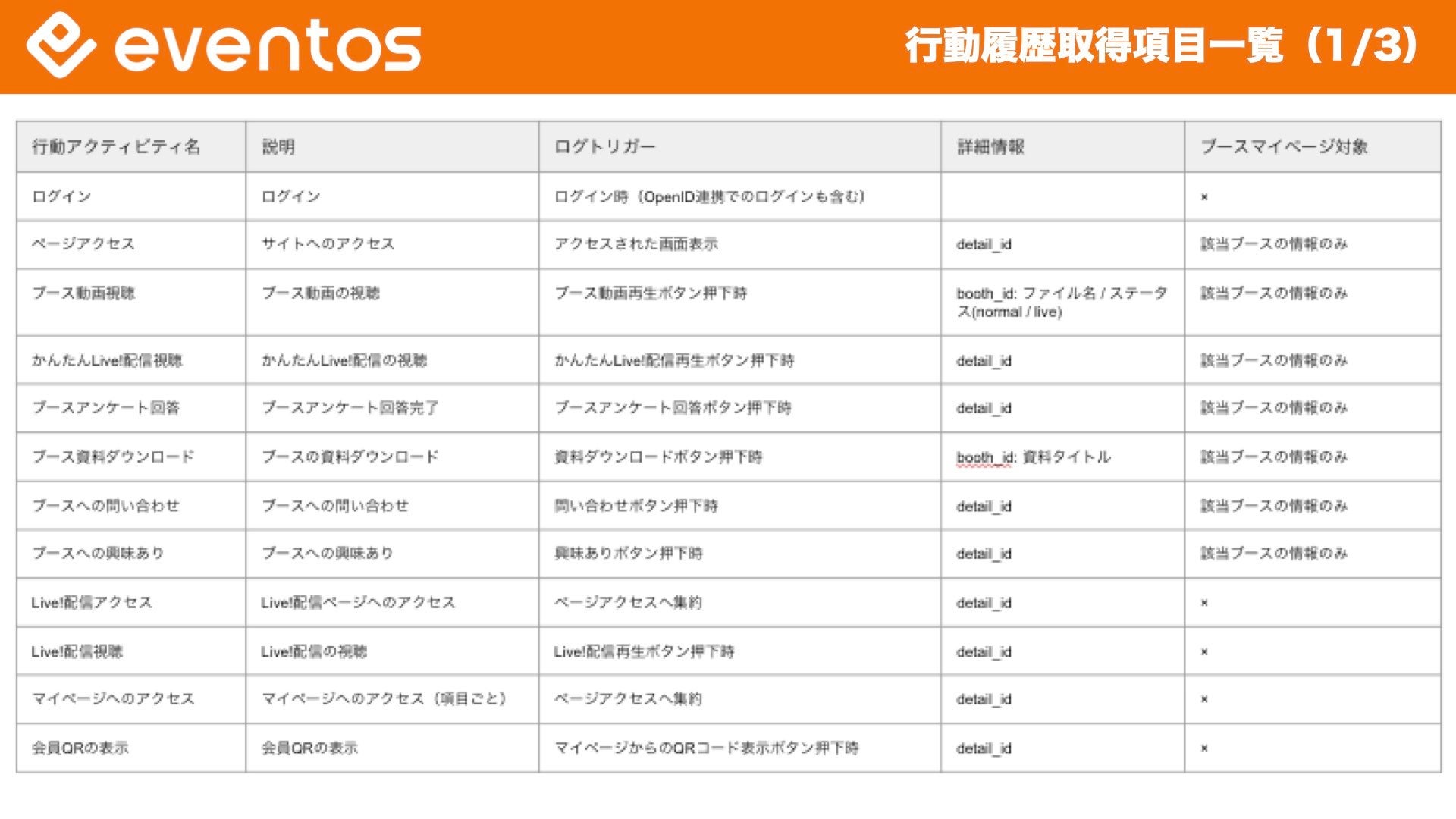 そのような背景のなか、今回リリースしたeventosの新機能「オールアクティビティ」においては、来場者がログインしてからどのような行動を取ったかの履歴情報を一括でログ出力が可能になりました。
