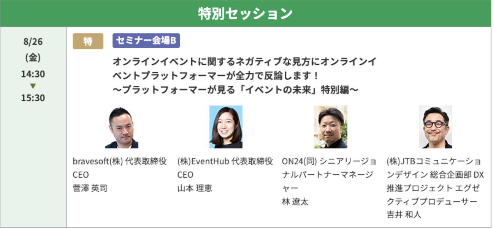 当日はeventosを導入した成功実績に加えまして、eventosで実現できるDXについてを担当者がブースにてお話させていただき、特別セミナーにおいてはbravesoft代表取締役の菅澤が特別セッションに参加させていただきます。